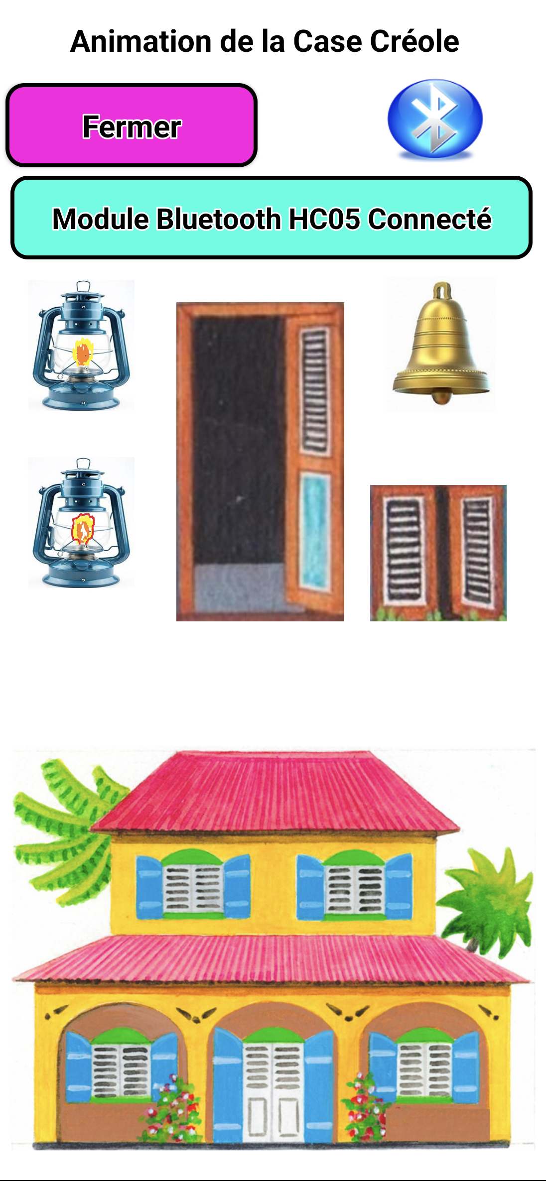 La première application sur Smartphone vous permet d'envoyer des ordres de commande via le système Bluetooth de votre appareil après la connexion réalisée avec la "Case Créole" dans laquelle un module Bluetooth HC-05 assure la liaison avec la carte Arduino MEGA2560 et lui transmet vos ordres sous la forme de chiffres codés. La carte Arduino traduit alors ces données reçues par des actions concrètes dans la Case Créole: allumage ou extinction de lumières, déclenchement d'une sonnerie, ouverture ou fermeture de portes ou fenêtres...